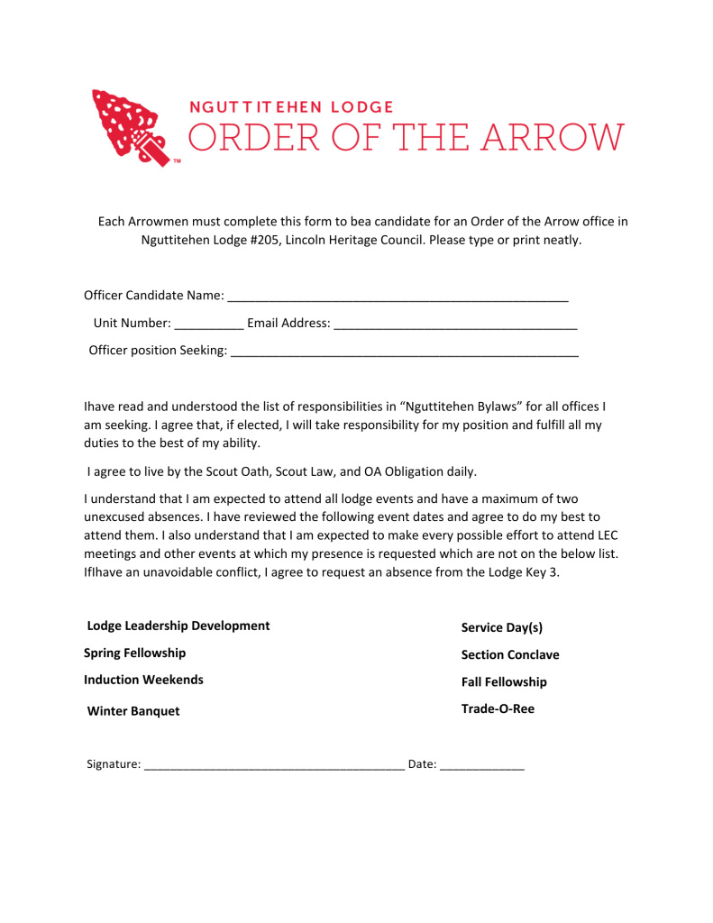 Click on this line for a printable version of the form. Please submit this form to the Lodge Adviser before the election at Fall Fellowship.